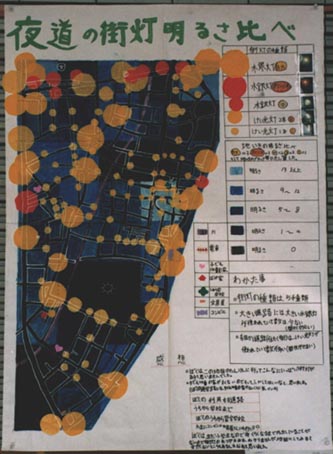習字の帰り道、ときどき暗いときがあるけど、暗いところと明るいところがあって、家周辺にはどのくらい街灯があるのかなあと思ったから地図を作りました。 街灯が全然なく、真っ暗なところもあったので、もっと街灯を増やしてほしいと思いました。また、子供110番も増やしてほしいと思いました。