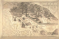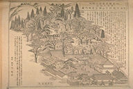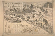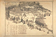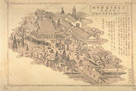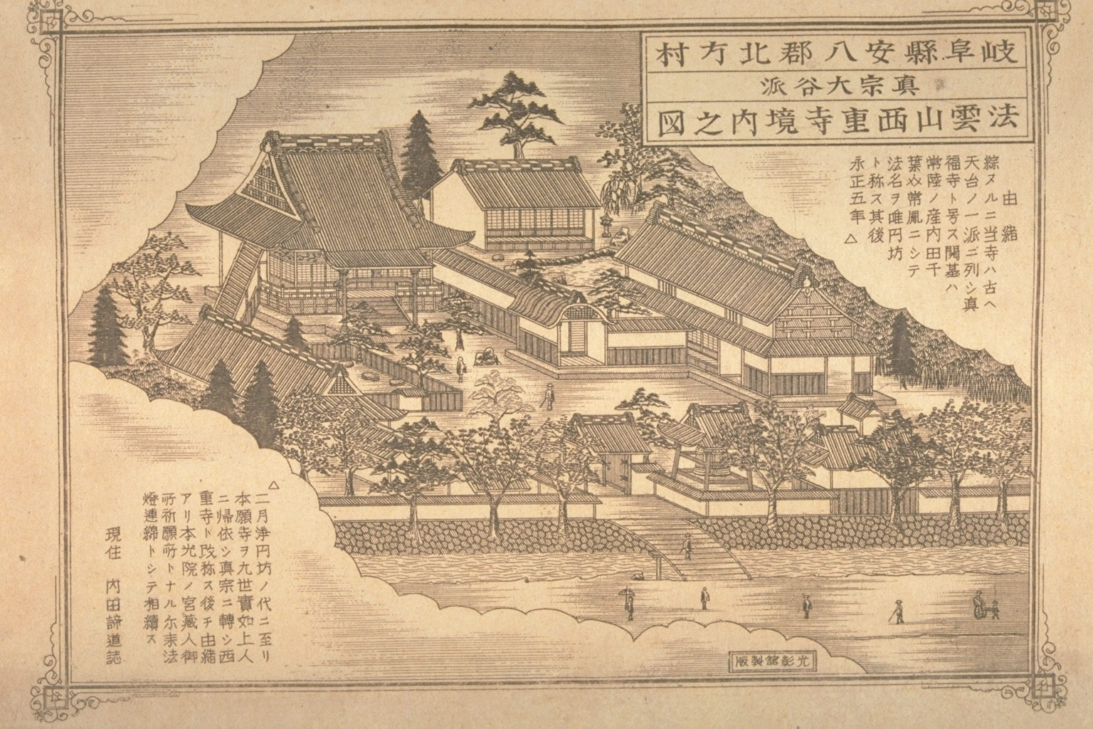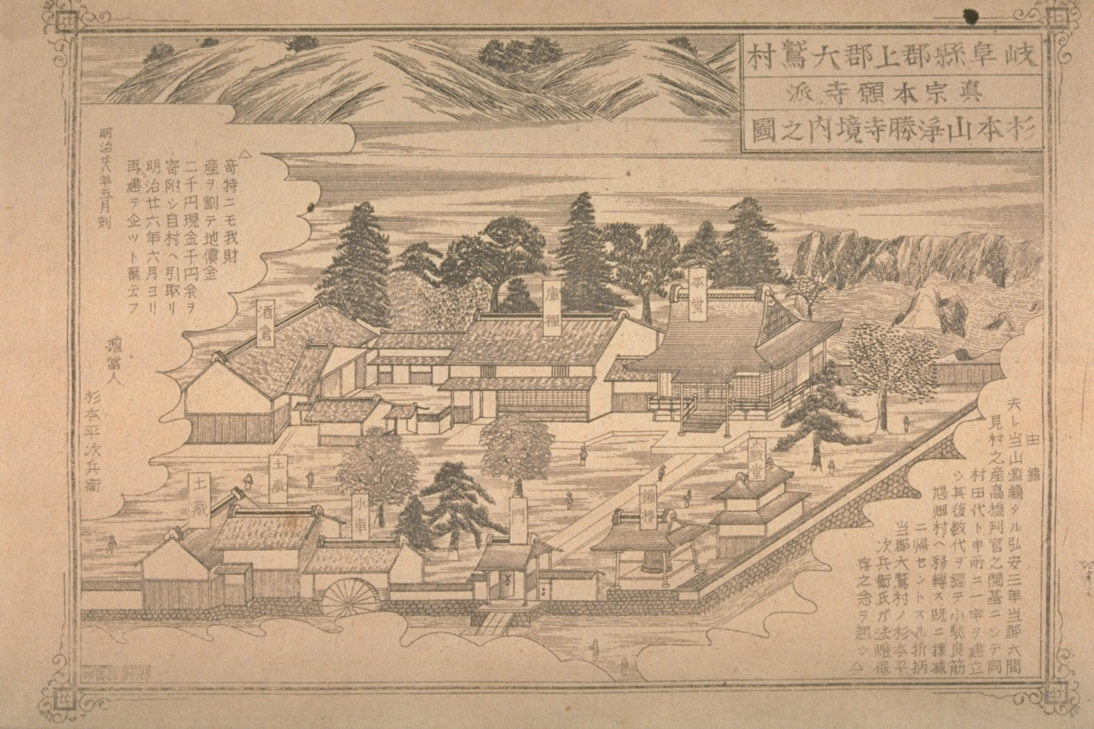 県内の神社・仏閣や名望家邸宅を一枚の絵にして由来とともに紹介し明治28年に刊行されたもの。著者は愛知三河の人であり、美濃を訪れた際に触れた社寺の歴史を後世に残そうと、改めて取材をして作成されたという。細密な銅版画の俯瞰図で建物や庭園の様子が描かれており、全景を立体的に見ることができる。