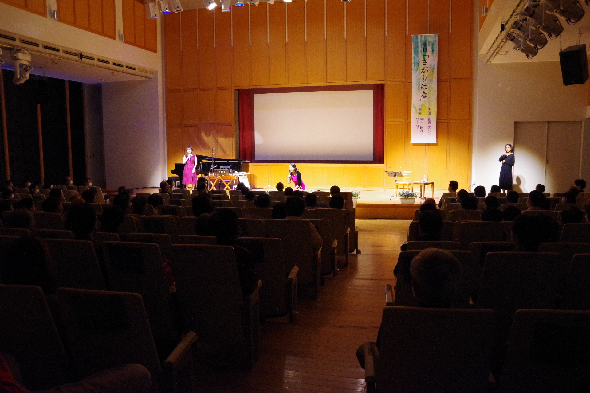 紺野美沙子さん、中村由利子さん、MiMiさんの明るく楽しいトークと、写真絵本「さがりばな」の主人公・サラの命のかがやきをひしひしと感じる朗読、そこにピアノとハンマーダルシマー等の演奏が加わり、美しく、心癒されるステージが展開されました。