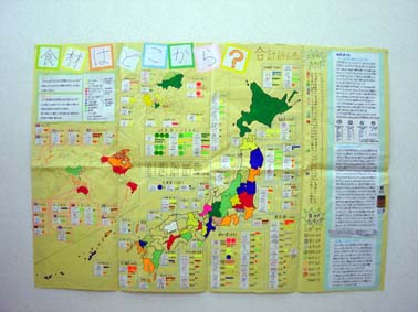 一日三食の記録を30日間続けて、その食材一つ一つがどこからきているのかを丹念に調べ、色別シールを使って表した地図作品です。