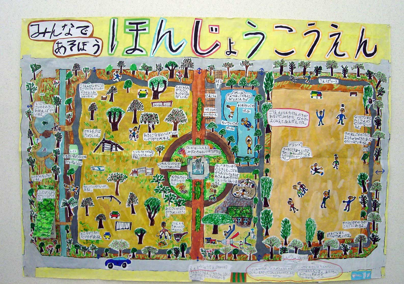 ぼくがいつもあそんでいるほんじょうこうえんは、楽しい場所がいっぱいあります。たくさんの人に来てほしいので、この地図を作りました。